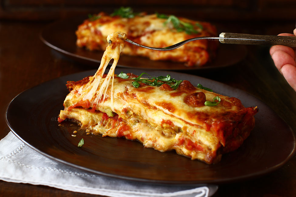Se coace tava, pregătită așa cum arătat mai sus, în cuptorul preîncins la 200 de grade Celsius timp de 30 de minute. În acest răstimp, brânza se va topi superb iar stratul superior se va rumeni frumos. Recomandarea mea este să așteptăm timp de 15 minute pentru ca mâncarea să se odihnească și să se răcească puțin, așa îi vom simți mai intens gustul și o vom putea porționa mai ușor.